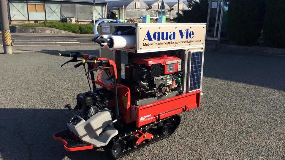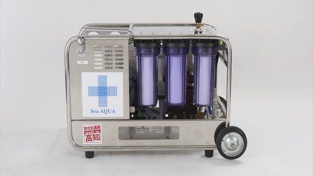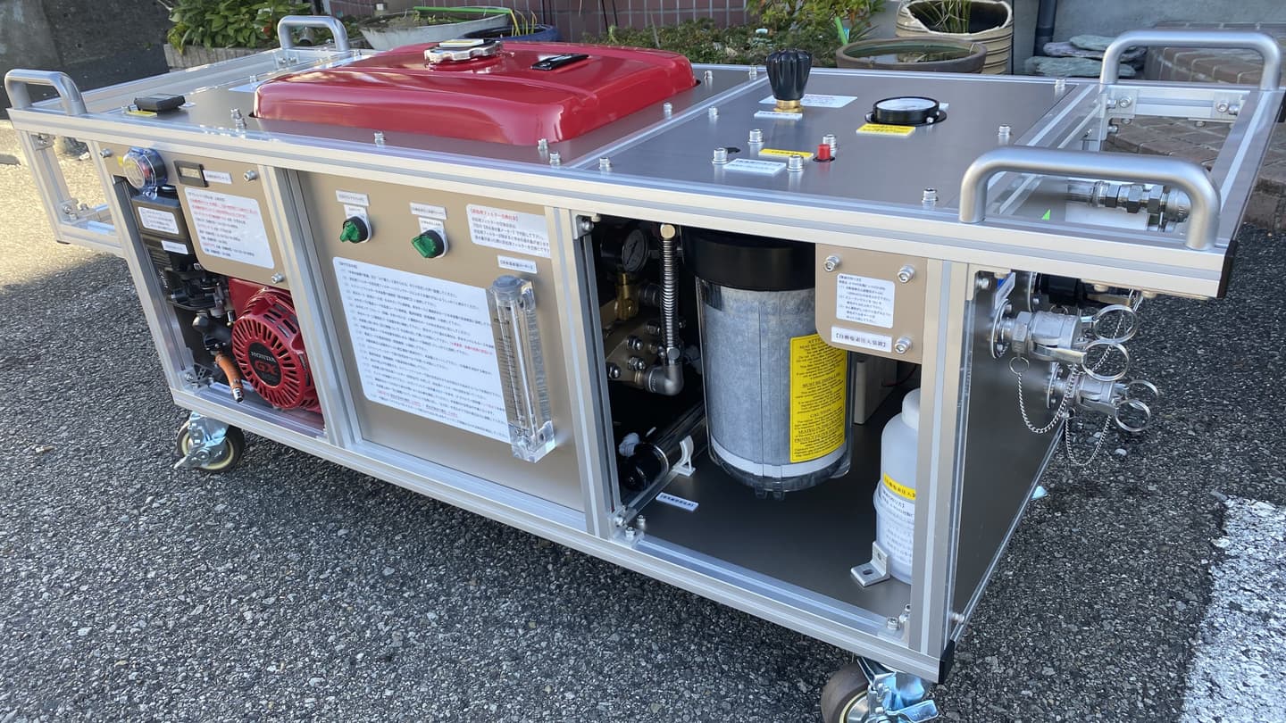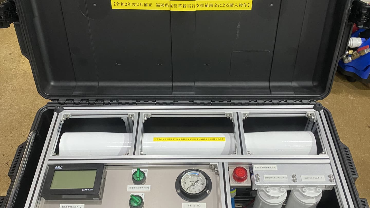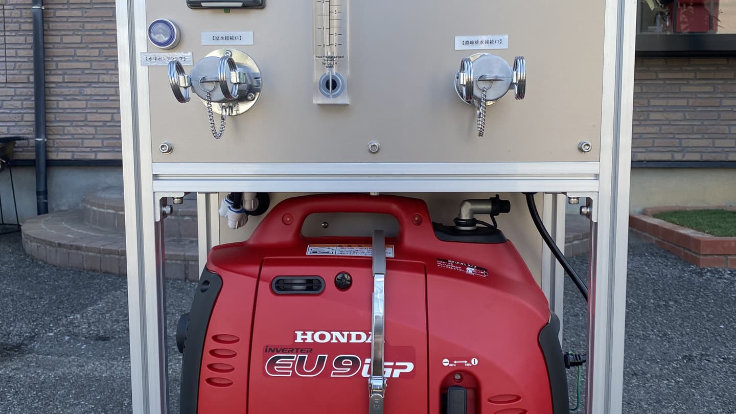 持ち運びが簡単でコンパクトな設計になっており、原水状況によっては、簡易ろ過(5ミクロンフィルター+中空糸膜フィルター)に自動塩素注入装置で塩素を添加した浄水を生活水として供給します。