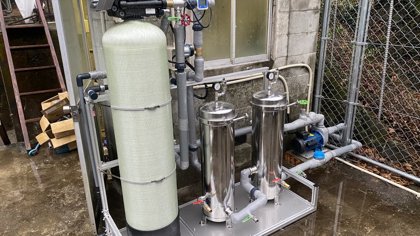 水道配管が出来ない山奥などの簡易水道施設用の浄水装置となり、浄水フローは砂ろ過装置(逆洗浄機能付き:自動または手動)+5ミクロンフィルター+高性能硬化カーボンフィルターとなります。