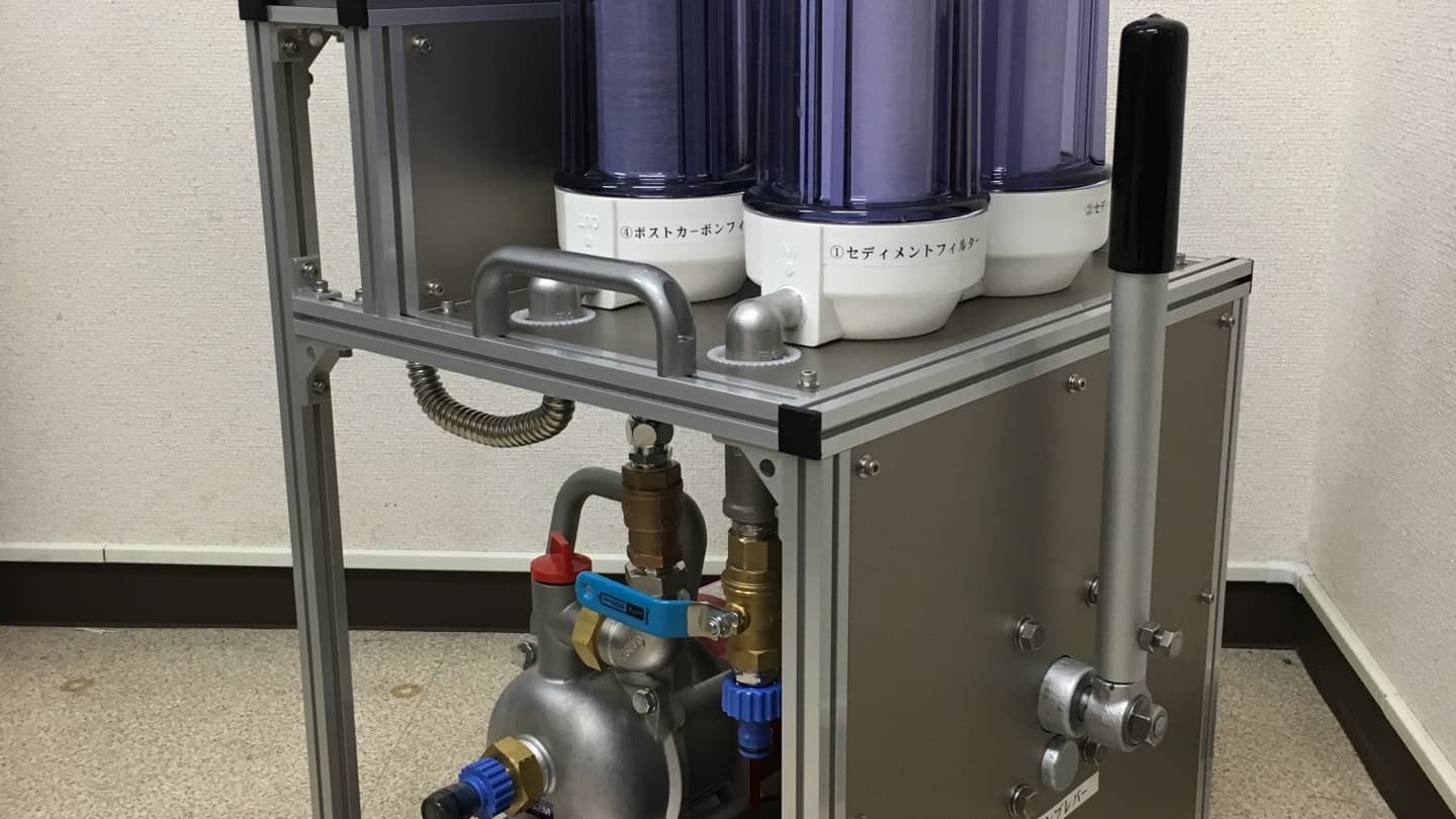 原水は、河川水や谷水、井戸水となり、本装置は基本的に濁度除去や臭気除去を目的とした簡易浄水装置となります。