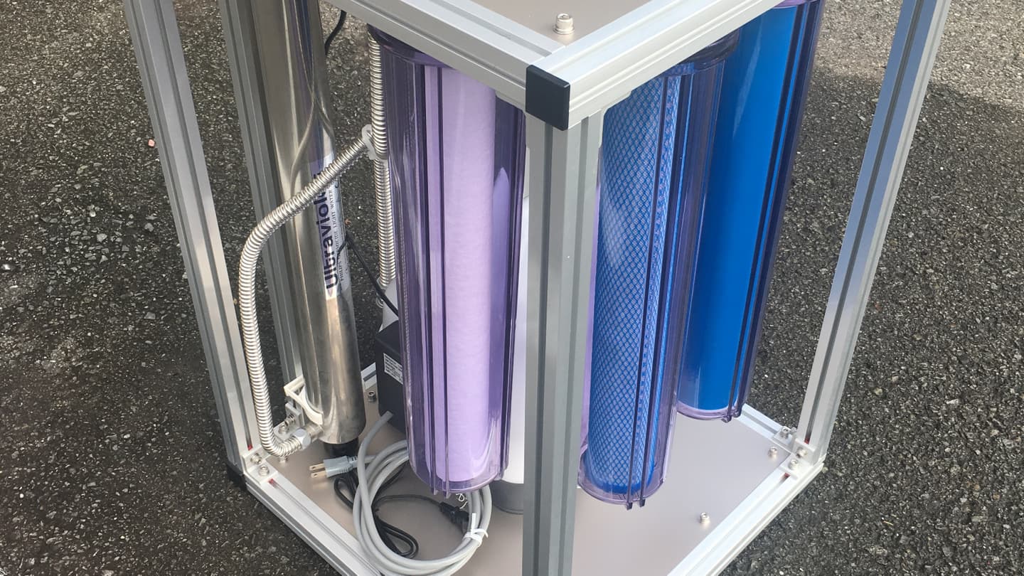 10インチサイズフィルターを4本直列に並べた簡易的な浄水装置となります。